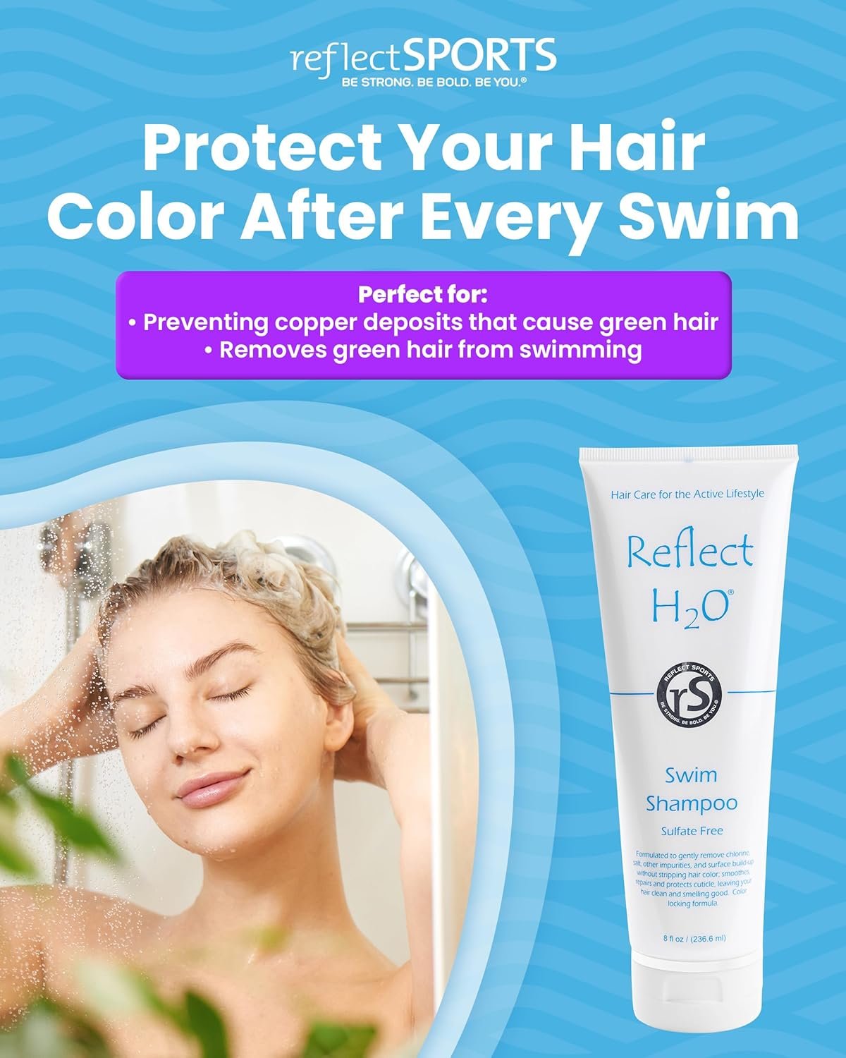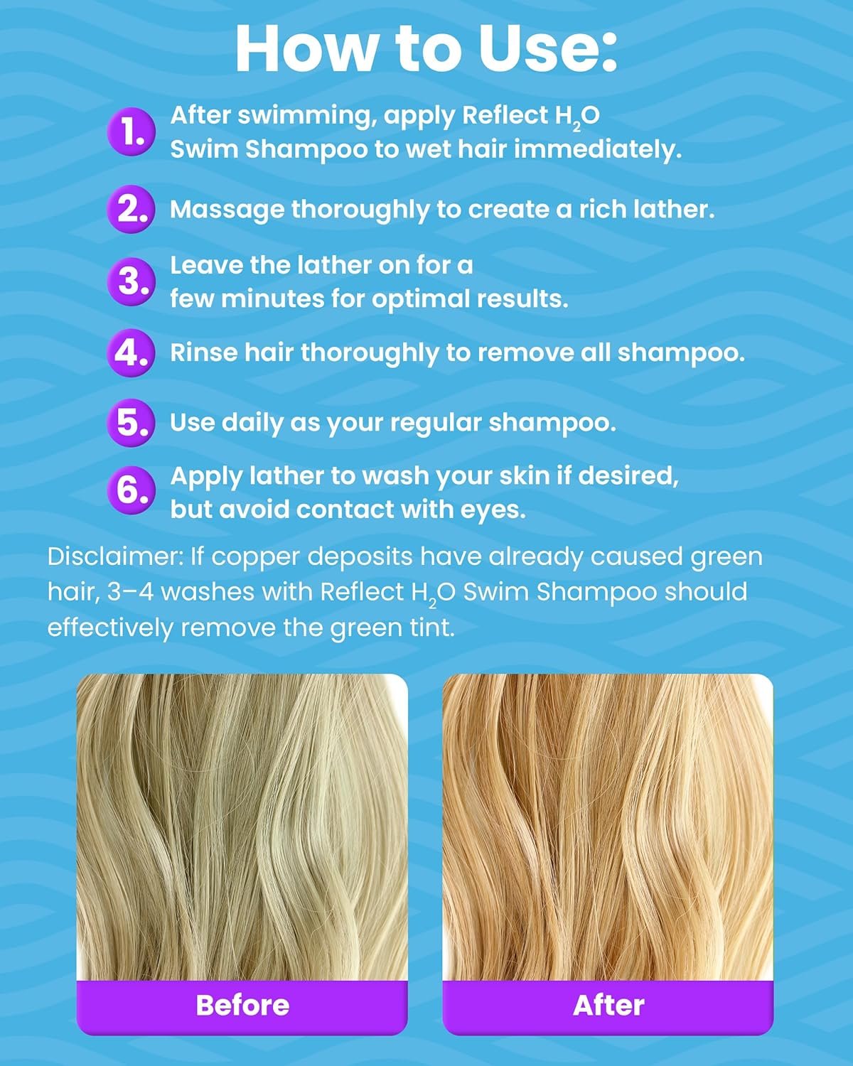 Pre & Post-Swim Hair & Body Cleanser: In just 3 to 4 washes, Reflect HշO Swimmer Shampoo effectively removes copper buildup that causes green hair, fading, and discoloration. This also removes chlorine odor for fresh, clean hair and skin.